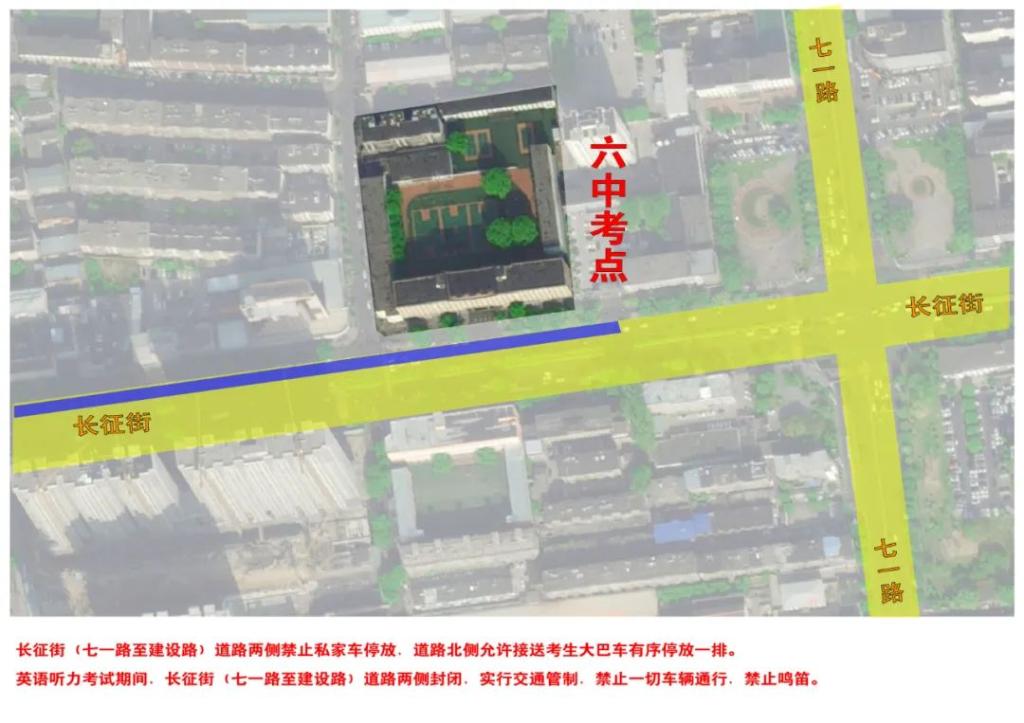 英语听力考试期间,长征街(七一路至建设路)道路两侧封闭,实行交通管制,禁止一切车辆通行,禁止鸣笛。