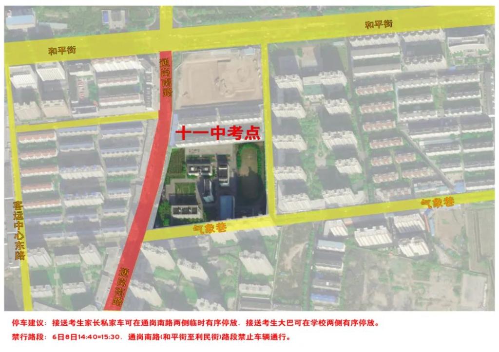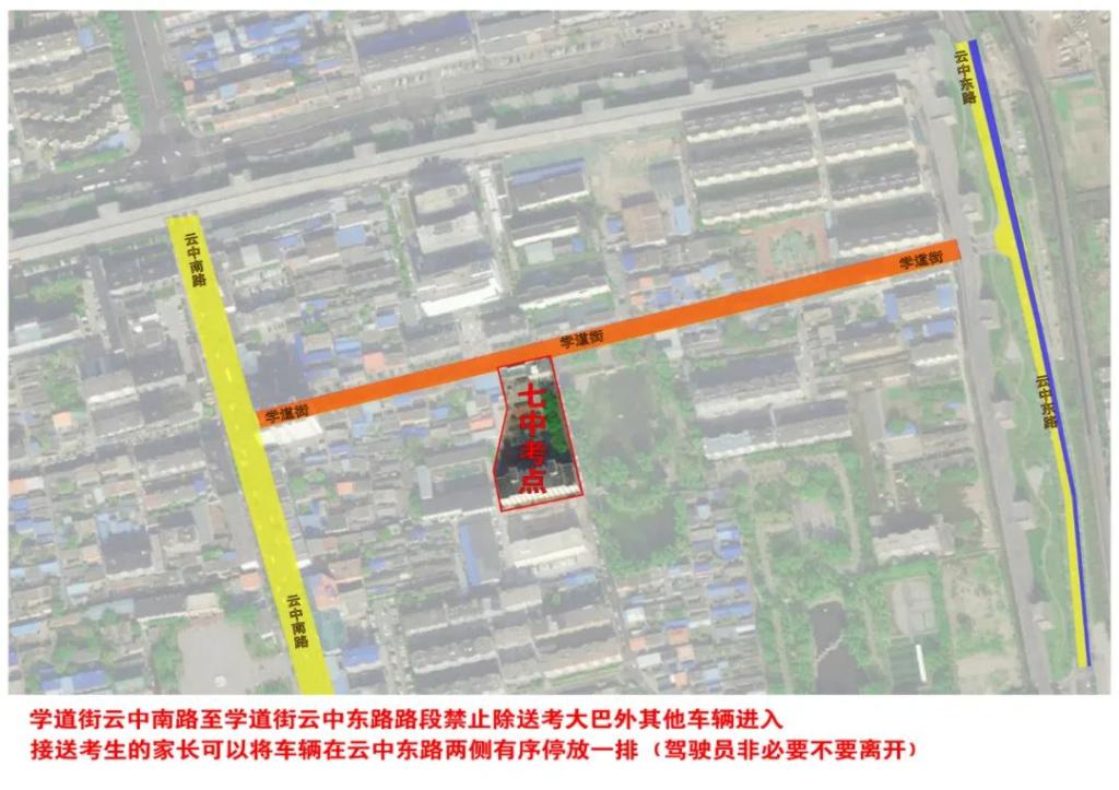 学道街(云中路至云中东路)禁止除接送考生大巴车以外的其他车辆驶入,道路南侧允许接送考生大巴车有序停放一排。