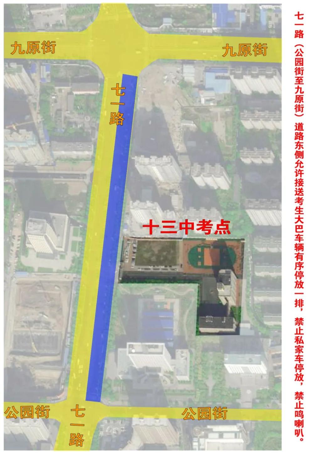 七一路(公园街至九原街)道路东侧允许接送考生大巴车辆有序停放一排,禁止私家车停放,禁止鸣喇叭。