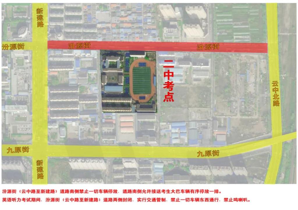 英语听力考试期间,汾源街(云中路至开发西街南二巷)道路两侧封闭,实行交通管制,禁止一切车辆东西通行,禁止鸣喇叭。