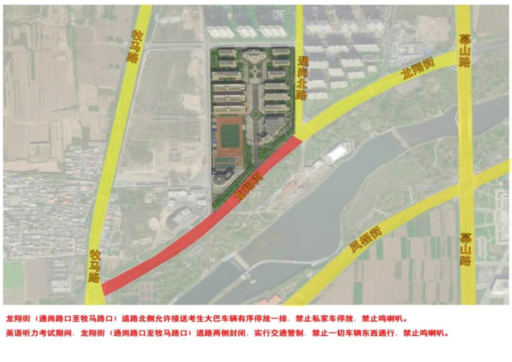 禁行路段:英语听力考试期间,龙翔街(通岗路口至牧马路口)道路两侧封闭,实行交通管制,禁止一切车辆东西通行,禁止鸣喇叭。