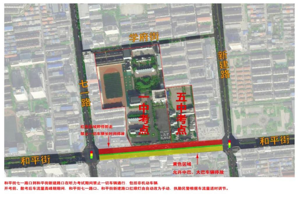 英语听力考试期间,和平街(七一路至新建路)道路两侧封闭,实行交通管制,禁止一切车辆东西通行,禁止鸣喇叭。