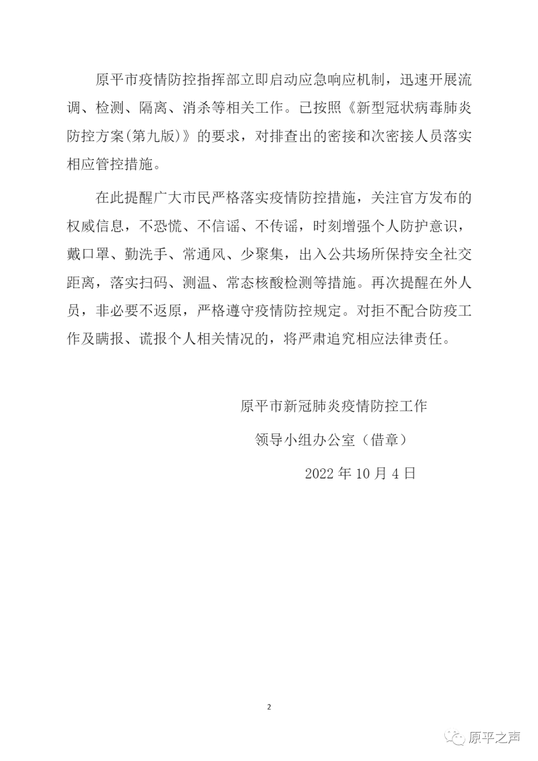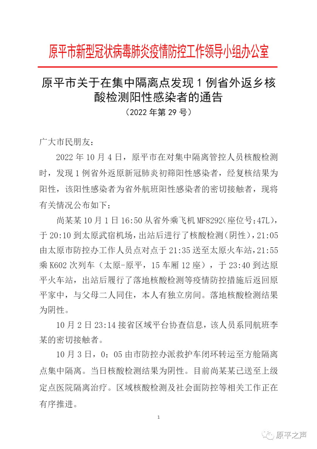 原平市关于在集中隔离点发现1例省外返乡核酸检测阳性感染者的通告