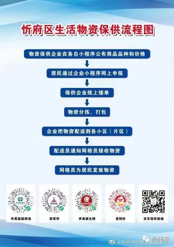 本轮疫情发生以来,忻府区精准施策,全力抓好粮油、肉类、禽蛋、蔬菜等居民基本生活物资供应,以快速到户到家为目标、以解决配送“最后一米”问题为重点,迅速建立货源组织、分拣包装、物资配送和到家到户的供应链,并加强健全完善“配送企业+街道社区+居民住户”的“三方对接机制”,推行线上订货下单、线下统一配送、居家无接触购物配送模式,实行保供企业线上接单、分拣、打包、配送,乡镇(街道)网格员接单配送到户的运行机制,确保全区居民基本生活需求供应保障到位。