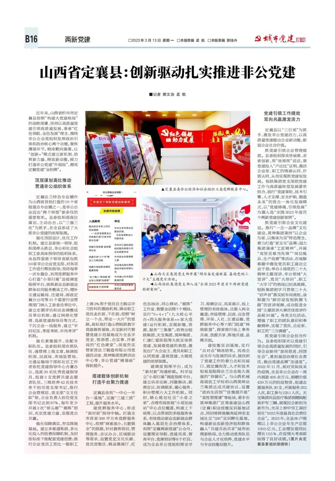 近年来,山西省忻州市定襄县按照“构建大党建格局”的战略部署,坚持以高质量党建引领高质量发展,秉承“红色领航、金色发展”理念,围绕非公企业党组织发挥政治引领和政治核心两个功能,聚焦薄弱环节,精准靶向施策,以“创新+”模式建立新机制、培育新力量、释放新动能,倾力打造非公党建“升级版”,擦亮定襄党建“金招牌”。