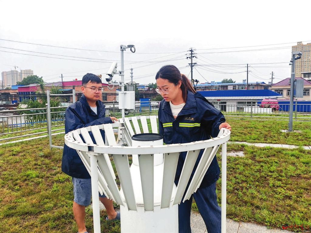 7月30日,气象业务人员冒雨检查降水监测仪器。
