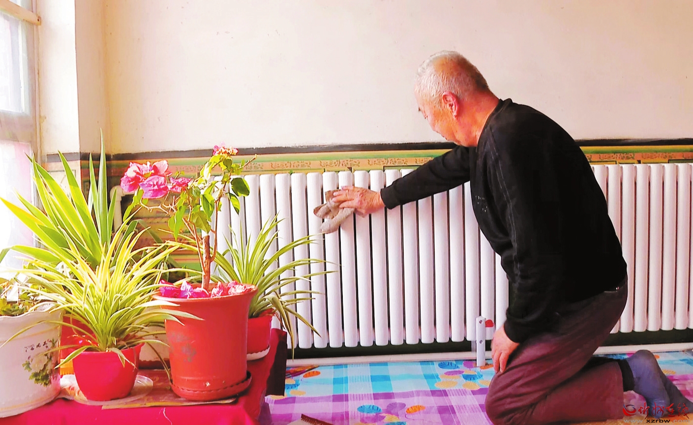 村民擦拭装在炕上的空气能暖气片