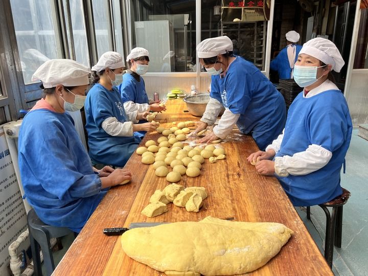 ▲润明饼业的工人们正在制作传统糕点制品。