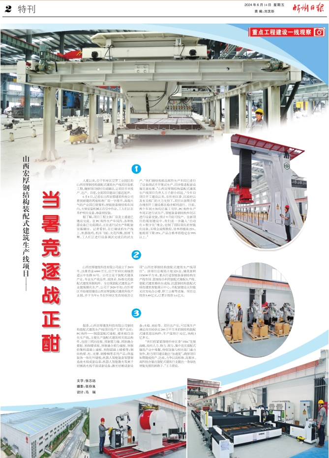 6月4日,记者在山西宏厚建筑科技公司看到新建的两座标准厂房一字排开,高端大气的产业园已现雏形;智能装备钢结构车间内,大型安装机械正在空中作业,工人们正在养护相关设备,准备预安装。