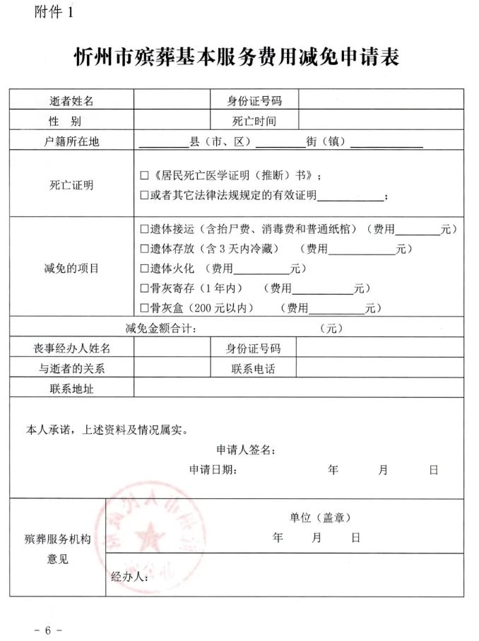 附件:1.忻州市殡葬基本服务费用减免申请表