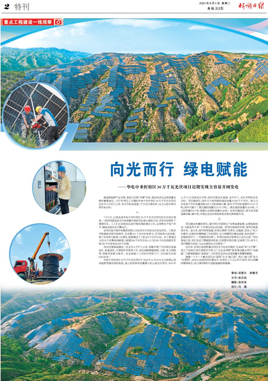 华电中来忻府区30万千瓦光伏项目于2022年12月29日正式获得山西省能源局建设指标批复,是山西省单体容量最大的山地光伏项目,2023年12月31日完成首次并网,成功实现当年备案、当年开工、当年并网的任务目标。项目建成后,每年可为电网提供清洁电量51585万千瓦时。按火力发电每千瓦时电量消耗300.7克标准煤计算,每年可节约标准煤约15.51万吨,每年可减少二氧化碳排放量约27.91万吨、二氧化硫排放量约42.8吨、飞尘排放量约8.7吨、氮氧化合物排放量约68吨。该项目建成后,将为我市推进碳达峰、碳中和,实现社会经济绿色转型发展发挥积极作用。