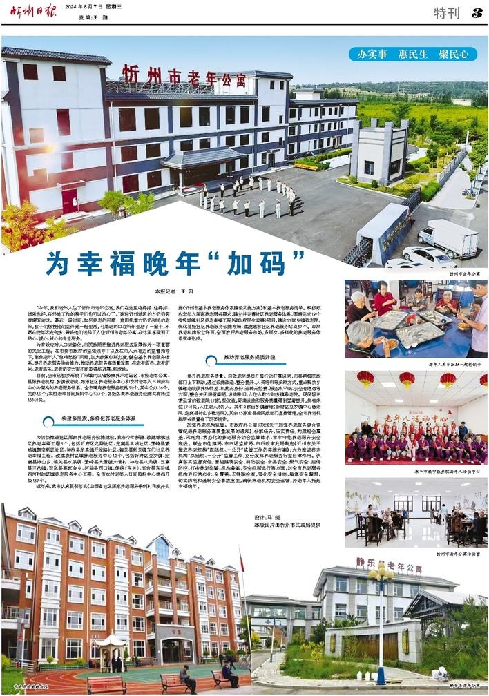 为加快推进社区居家养老服务设施建设,我市今年新建、改建城镇社区养老幸福工程5个,包括忻府区龙翔社区、定襄县北城社区、繁峙县繁城镇聚宝新区社区、神池县龙泉镇开发路社区、偏关县新关镇东门社区养老幸福工程。改建农村区域养老服务中心10个,包括忻府区豆罗镇、定襄县神山乡、偏关县水泉镇、繁峙县大营镇大营村、神池县八角镇、五寨县三岔镇、岢岚县高家会乡、河曲县西口镇、保德(东关)、五台县东冶镇西河村的区域养老服务中心工程。全市农村老年人日间照料中心提档升级169个。