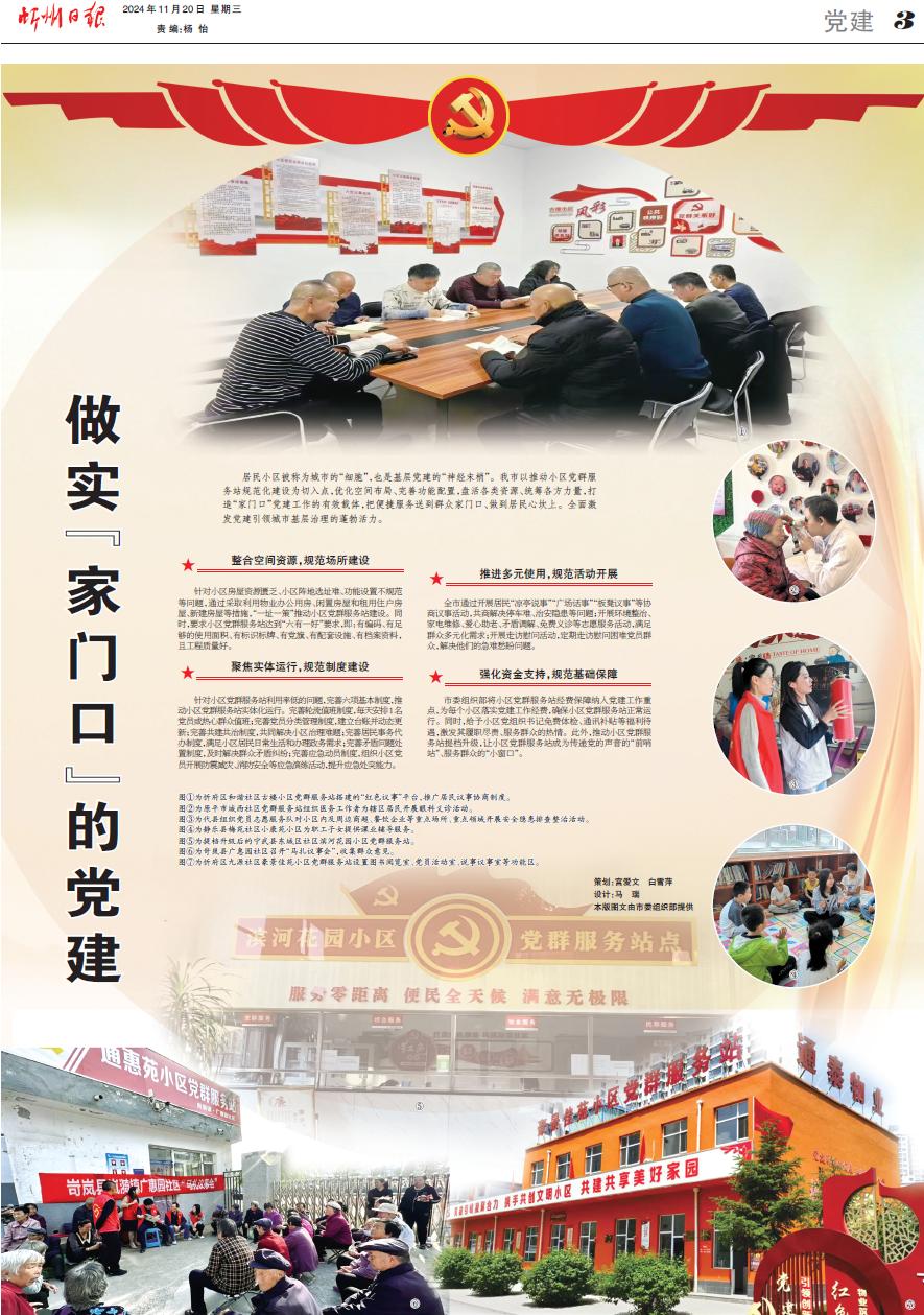 居民小区被称为城市的“细胞”,也是基层党建的“神经末梢”。我市以推动小区党群服务站规范化建设为切入点,优化空间布局、完善功能配置,盘活各类资源、统筹各方力量,打造“家门口”党建工作的有效载体,把便捷服务送到群众家门口、做到居民心坎上。全面激发党建引领城市基层治理的蓬勃活力。