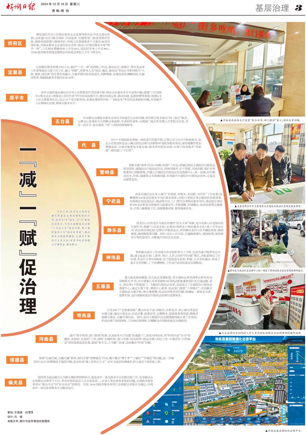 打造329个“全要素网格”,整合村社干部、网格员、在职党员、热心群众等基层治理力量,通过日常走访、信息采集、政策宣传、志愿服务、隐患排查等渠道,精准对接群众需求,化解矛盾纠纷。同时,依托大数据平台定期调度网格日常工作情况,形成治理下放到网格、工作细化到网格、问题解决在网格的基层治理格局。