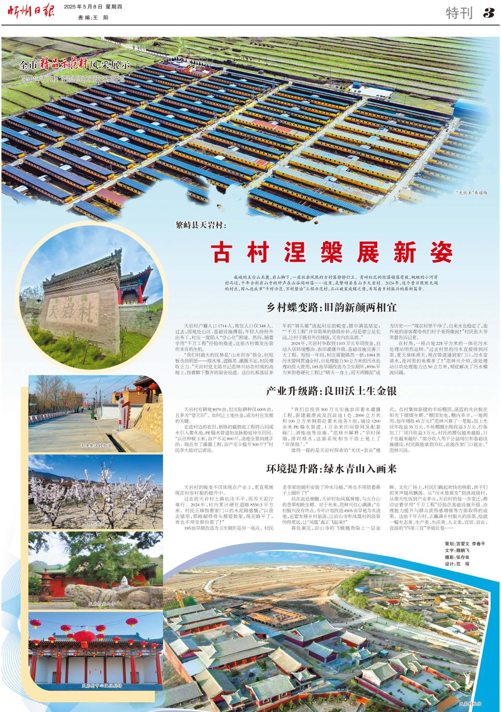 站在高处俯瞰,天岩村如凤凰展翅,与五台山的苍翠相映生辉。对于未来,范林兴信心满满:“乡村振兴没有终点,今年计划改造4505亩旱地为水浇地,还要发展乡村旅游,让岩山寺和凤凰村的故事传得更远,让‘凤凰’真正飞起来!”