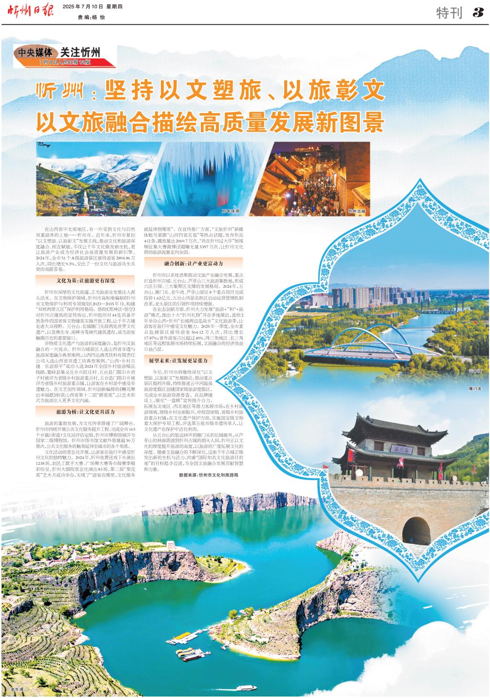 在山西省中北部地区,有一片受到文化与自然双重滋养的土地——忻州市。近年来,忻州市紧扣“以文塑旅、以旅彰文”发展主线,推动文化和旅游深度融合、相互赋能,不仅让千年文化焕发新生机,更让旅游产业成为经济社会高质量发展的新引擎。2024年,全市51个A级旅游景区接待游客2894.86万人次,同比增长9.3%,交出了一份文化与旅游共生共荣的亮眼答卷。