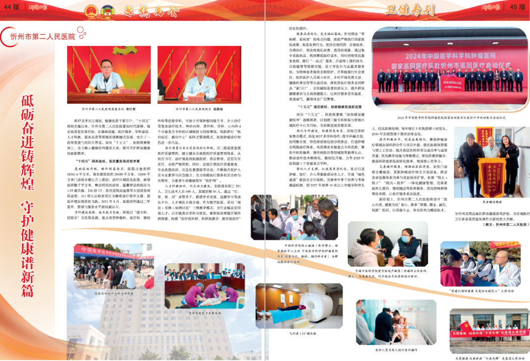 医疗关乎民生福祉,健康连着千家万户。“十四五”规划实施以来,忻州市第二人民医院紧扣时代脉搏,锚定高质量发展目标,在基础设施、医疗服务、学科建设、人才科教、服务品质等领域实现跨越式发展,交出了一份厚重提气的民生答卷。面向“十五五”,医院将乘势而上,全力融入健康忻州建设大局,续写守护群众健康的崭新篇章。