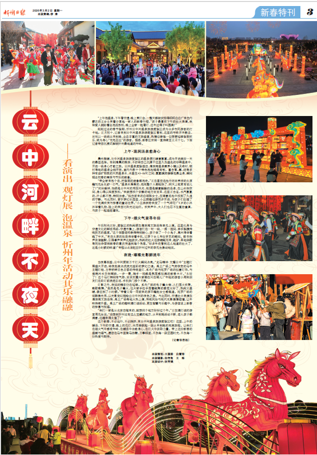 “上午泡温泉,下午看非遗,晚上赏灯会,一整天都被安排得明明白白!”来自内蒙古的王女士笑着分享她一家人的新春行程,“孩子最喜欢下午的社火表演,我和爱人就盼着去泡汤放松,晚上全家一起看灯,这年过得才叫圆满!”
