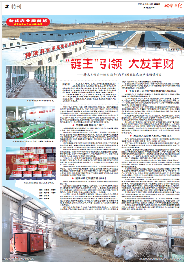 作为神池现代农业产业示范区“链主”企业,天牧生物已构建起一条集种羊繁育、生态养殖、精细屠宰、精深加工、中央厨房、冷链物流、销售平台、绿色餐厅于一体的全“羊”完整产业链。目前,公司拥有2座现代化种羊场、6座万只生态肉羊养殖基地、1条年屠宰15万只羊生产线、1条年精深加工3000吨肉羊生产线以及1座现代化中央厨房,有效促进了县域肉羊全产业链发展。