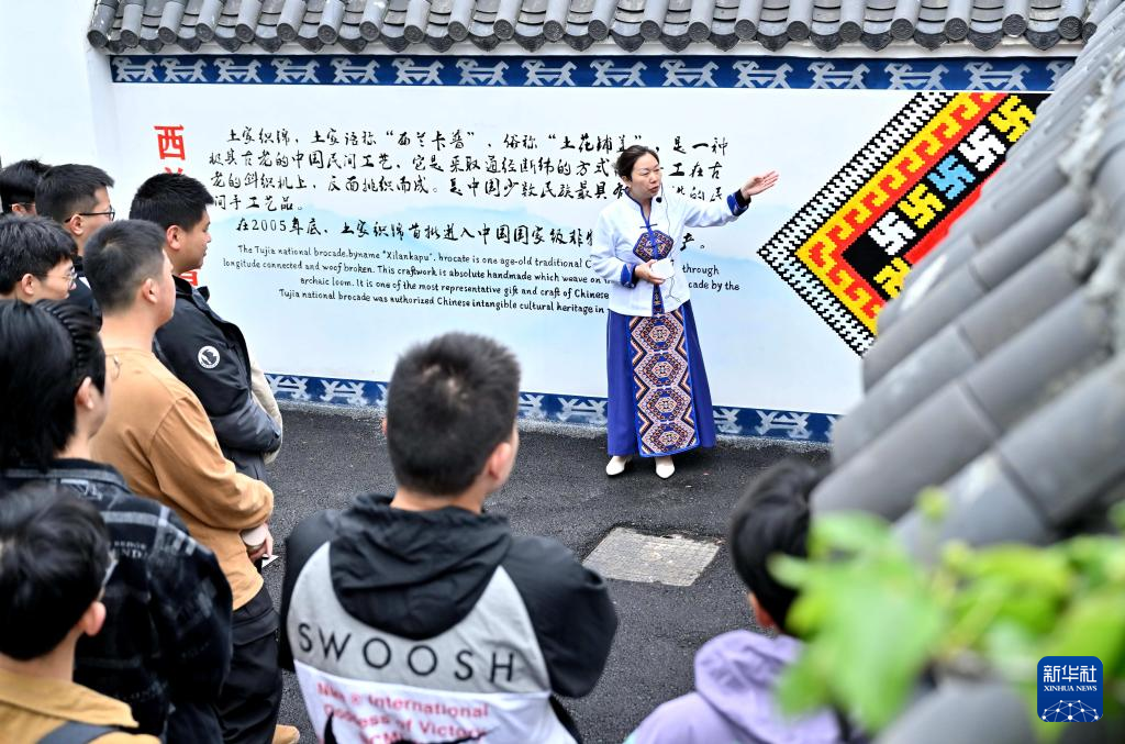 4月24日,在宣恩县高罗镇麻阳寨村的西兰卡普传承基地,湖北民族大学的学生在展厅参观。