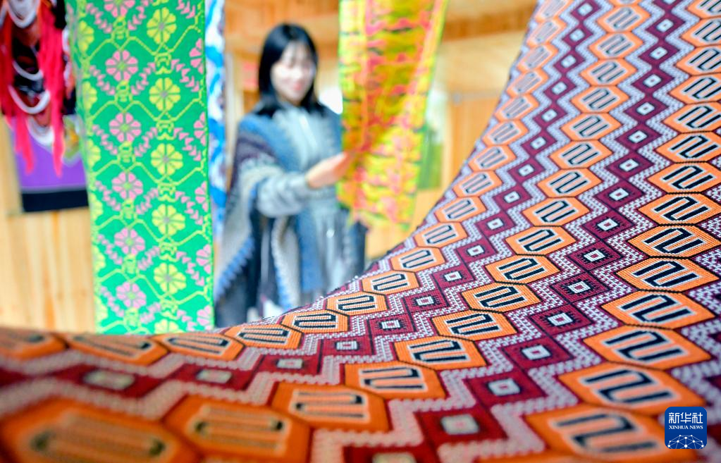 春暖花开时节,湖北省宣恩县西兰卡普传承基地迎来各地的学生前来研学。学生们在这里了解土家织绵文化、学习传统手工技艺,感受非遗文化的魅力。西兰卡普是一种土家织锦,色彩鲜明,纹样美观,其编织技艺被列入国家级非物质文化遗产名录。新华社发(宋文摄)