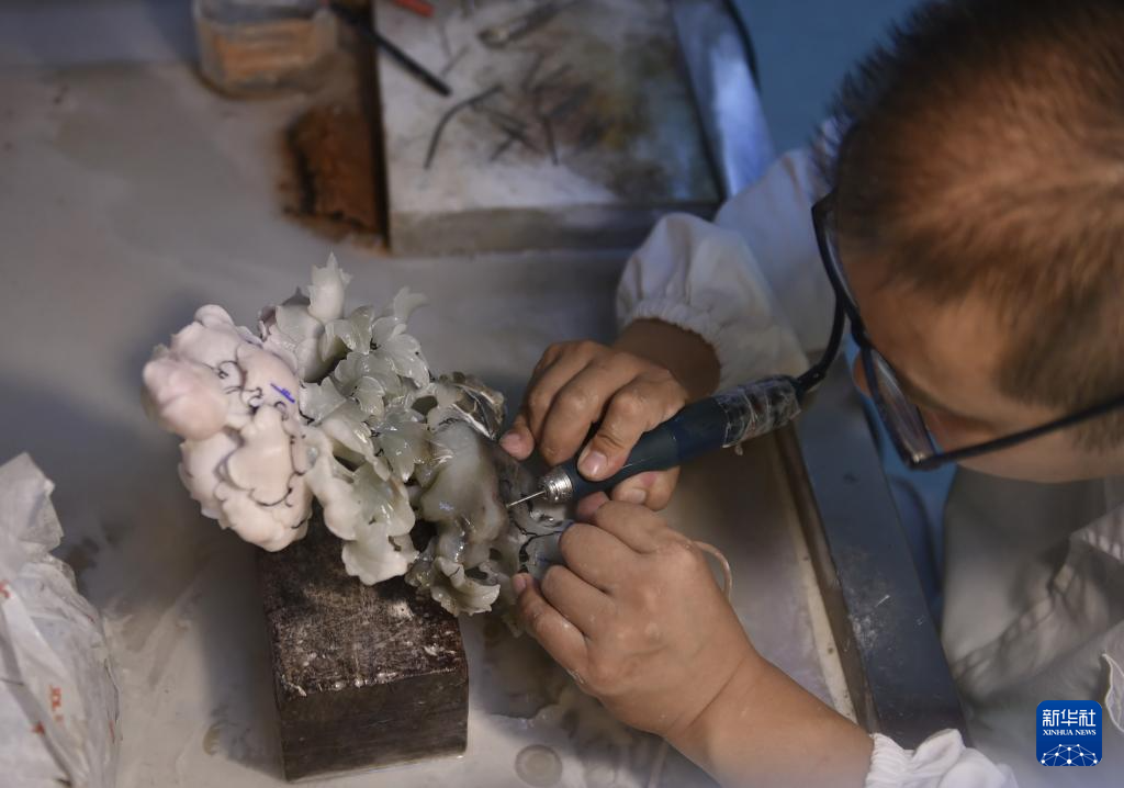 河南省镇平县素有“中国玉雕之乡”的美誉。近年来,该县积极发展新型业态,拉长产业链条,推进产旅融合,助力玉文化特色产业高质量发展。目前全县共有玉雕专业村50个,玉雕专业户近1.5万户,成为国内知名的玉雕产品加工、销售集散地。(新华社记者 鲁鹏 摄)