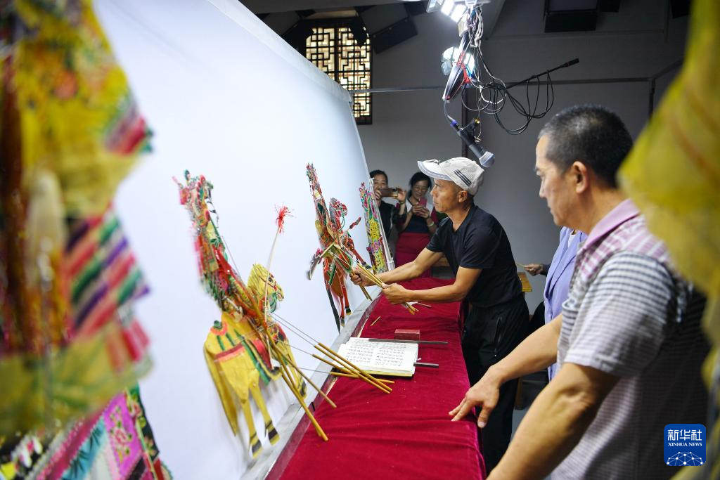 9月16日,皮影戏艺人在玉田县“非遗会客厅”皮影工坊内表演皮影戏。