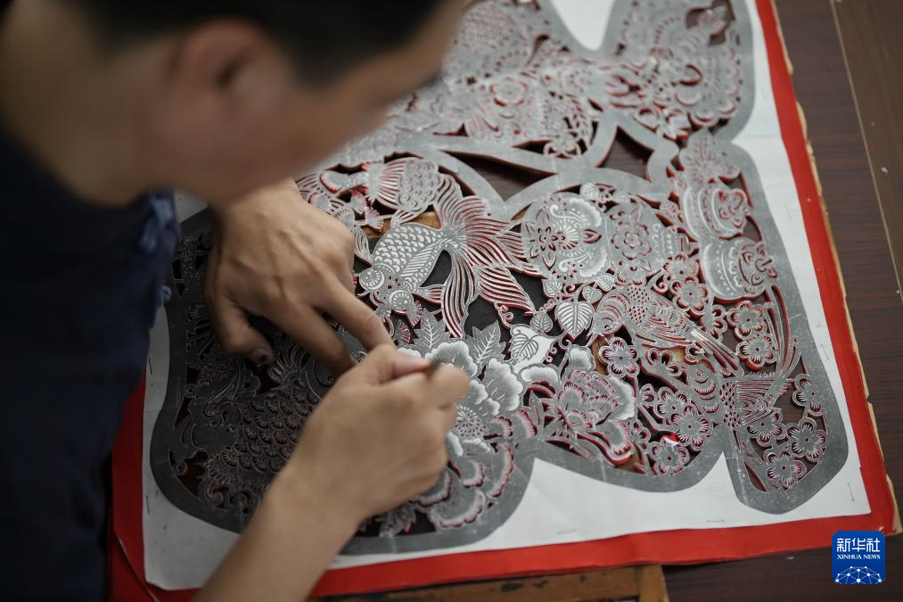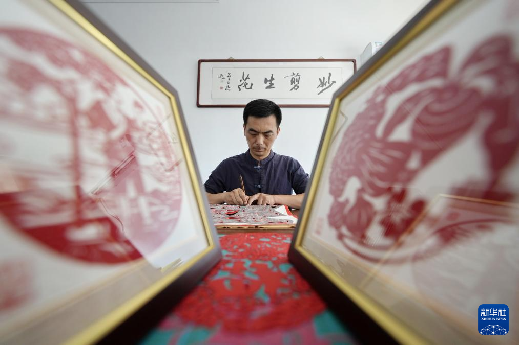 9月16日,剪纸艺人在玉田县“非遗会客厅”工作室内创作“福”字剪纸作品。