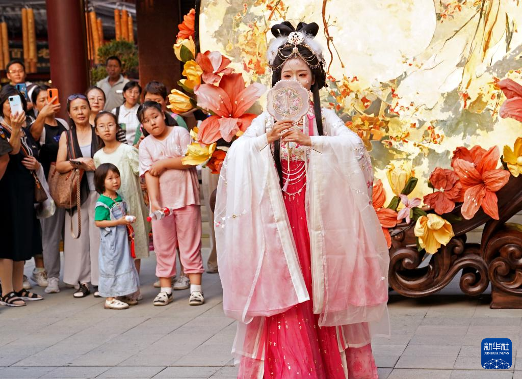 当日,作为“2023上海旅游节”系列活动之一,豫园商城2023“仲秋月神游”活动正式启幕。即日起至9月28日,游客可在中秋主题的互动场景中,游园赏月,欣赏演出,参与互动,共赏古风佳节浪漫,共享传统文化之美。新华社记者 刘颖 摄
