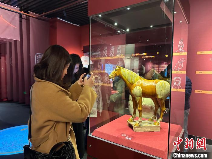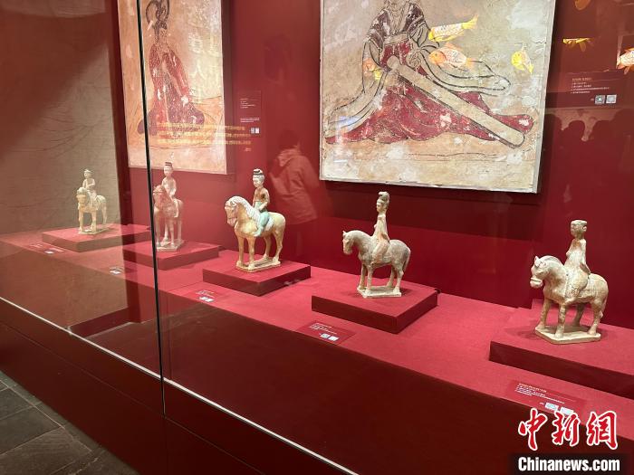 唐墓中的壁画和彩色陶俑是唐代极具代表性的艺术珍品。记者在展厅看到,女性陶俑类型多样,各种女坐俑、立俑、侍俑、乐舞俑、骑马俑、贵妇俑……这些女俑造型生动,尤其是三彩女俑,釉色艳丽,呈现了唐代女性“千人千面”的生存状态。