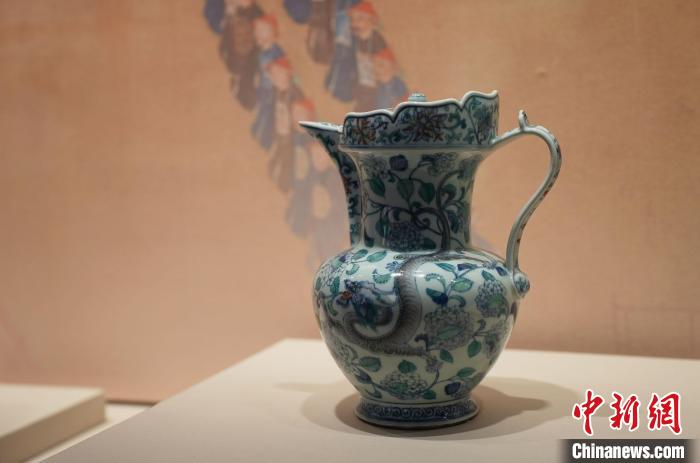 2月27日,正在“御瓷归来”展览上展出的“清乾隆时期斗彩螭龙穿花纹僧帽壶”。 刘思伟 摄