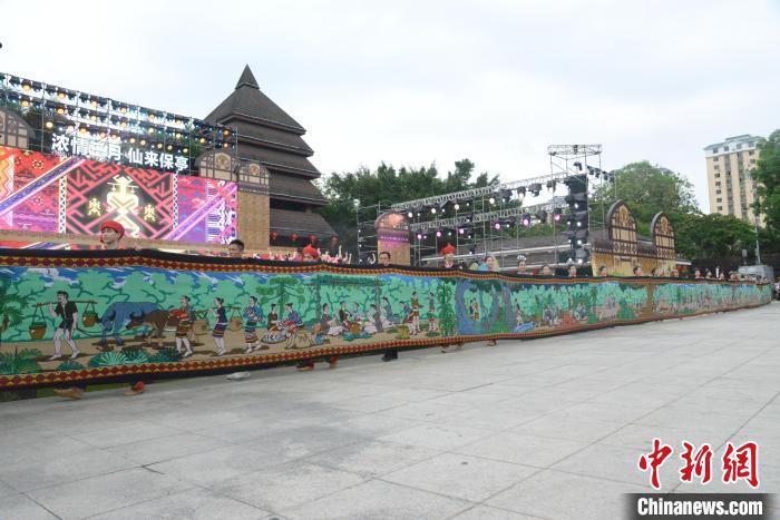 4月11日,2024年海南黎族苗族传统节日“三月三”节庆活动主会场开幕式暨文艺演出在保亭黎族苗族自治县举行。图为黎族民俗风情黎锦长卷展示。张月和 摄