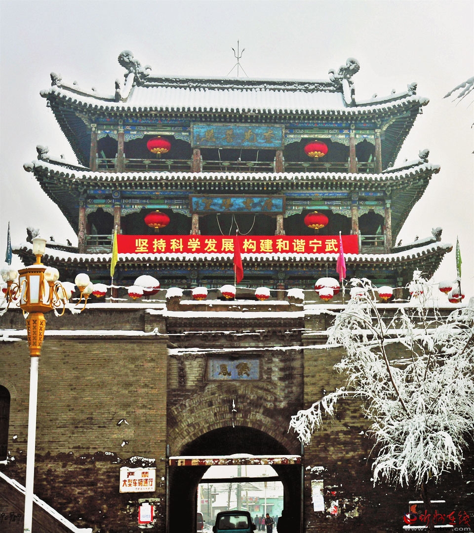 宁武关城,古称凤凰城,因为城南面对的是凤凰山,又因城池布局酷似展翅欲飞的凤凰而得名。顺华盖山南麓因势而筑的城池犹如凤身,华盖山顶的护城墩为凤首,向东西两侧延伸的大河堡、宁文堡犹如凤凰展开的双翅,高高耸立于南城墙的迎薰门是凤尾,城内中心的鼓楼是心脏。站在城南的凤凰山瞭望这座城池,日间城垛高垒,夜间万家灯火,由低而高,一只栩栩如生的凤凰便展现在眼前。