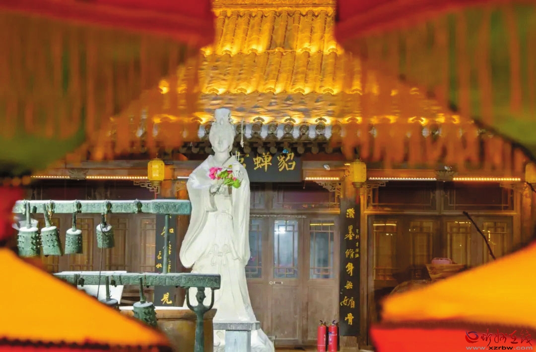 现在的貂蝉陵园是在墓地原址重新筑砌的,坐北朝南,门檐上悬“貂蝉陵园”横匾,两侧有“闭月羞花堪为中国骄傲,忍辱步险实令须眉仰止”的金文楹联。园内用花墙分隔成南、北两部分,北为陵区,南为展区。南院建貂蝉彩塑馆,再现“貂蝉迎宾”“羞花问世”“祭山惊艳”“落难认父”“拜月铭志”“忧国请缨”“施计除奸”“绣袍寄情”等场面,反映了貂蝉“不惜万金躯,何惧险象生”的一生。