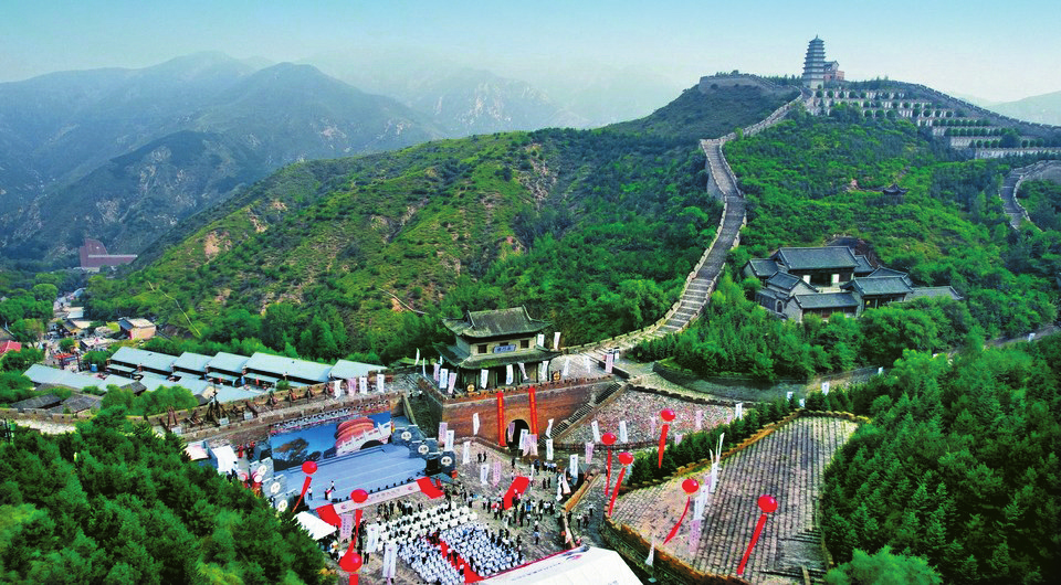 夏日的雁门关山花烂漫,翠林如海,行车穿梭在蜿蜒曲折的山路上,远远地就能望见雄踞在崇山峻岭之间的雁门关关楼,连同两侧屹立对峙的山峰,如同雄鹰展翼,蔚为壮观。