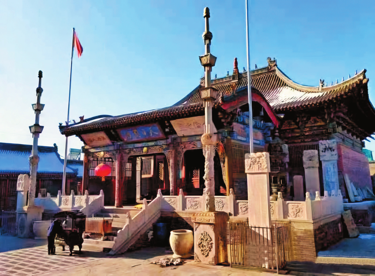 代县武庙又名“关圣大帝庙”,位于代县城西南隅,始建于元代,明、清两朝均有重修。寺庙坐西向东,门前有一座四柱七檐牌坊,牌坊正中横书“壮穆忠武”,竖写“武庙”,两侧配石狮一对、木旗杆一双。寺庙前院正东为进深三间的双檐歇山顶乐楼,对面是进深两间的献殿,殿内置大型铜铸贡桌。献殿后为进深三间的主殿关帝殿,为庑殿顶建筑,殿内神台正中为关圣帝君,左右两旁分别是威显侯关平、武烈侯周仓。此外,前院还建有战功房和碑房,碑房内有历代石碑若干通,详述历代武庙修葺始末。