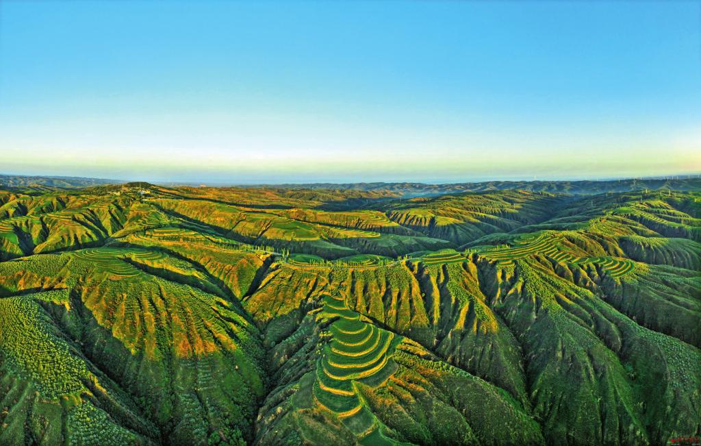站在赵家沟的山顶看日出是一件赏心悦目的事情。8月4日早晨,当朝阳从东方的山峦喷薄而出,在万丈霞光的映照下,莽原织绣,梁峁吐翠,田畴如画,生机勃发。居高临下看到的夏日晋北高原美景妙不可言,使人陶醉。