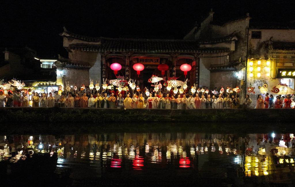 9月15日,花灯表演队伍在安徽省黄山市黟县宏村巡游(无人机照片)。新华社发(施亚磊 摄)