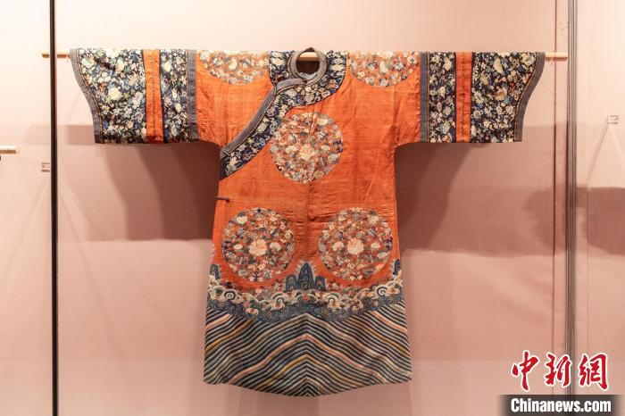 “这件吉服袍是清代满汉服饰文化交融的重要见证:满族作为北方游牧民族,为适应骑射之需,其传统袍服多为‘紧身窄袖’样式,清代中后期,受到汉族女装宽身博袖造型影响,满族宫廷女性吉服袍的袖筒及马蹄袖口变得更加肥阔。”田辉说。