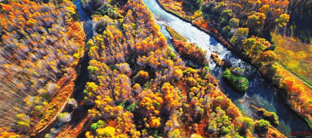 汾河两岸景色美。图为记者近日航拍的静乐汾河川国家湿地公园秋景。(