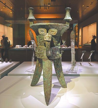 殷墟博物馆与殷墟宗庙宫殿区隔河相望,是全景式展现商文明的国家重大考古专题博物馆。图为殷墟博物馆里展出的殷墟妇好墓出土的铜斝。