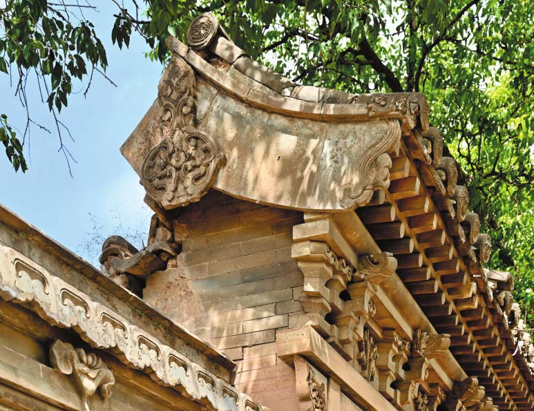 ▲代县鹿蹄涧村硬山顶砖雕悬鱼,菱形石榴、蝙蝠、缠枝瑞草图案。