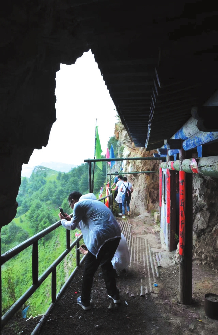这座老君庙开凿于峰峦半腰,面临绝壁,其险异常。幸得今人用粗大铁管焊接成简易护栏和扶手,游人才不至于恐高惧怕。