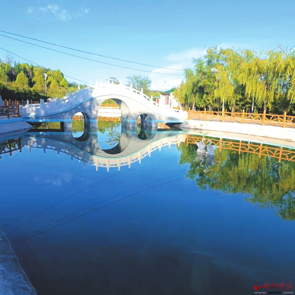 沿路而下,过桥爬坡,便到了天鹅湖。谁能想到,这碧水涵虚的景致,原是当年造林蓄水的大水坑?工程完工后顺势修整,竟成飞龙山又一胜景。天鹅湖呈葫芦状,汉白玉拱桥横跨腰间如玉带,桥东石雕飞龙昂首欲飞,桥西石雕双鹅戏水憨萌。湖水清澈见底,倒映蓝天白云绿树,风过时涟漪扩散,美得让人心醉,连时间都慢了下来。