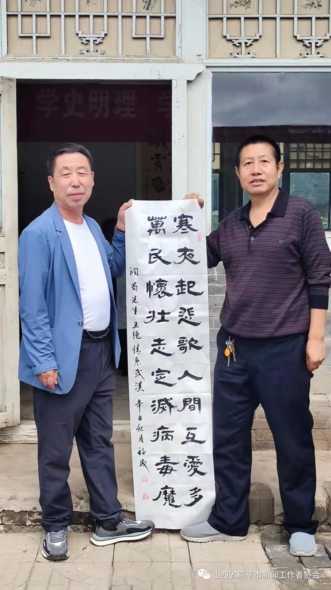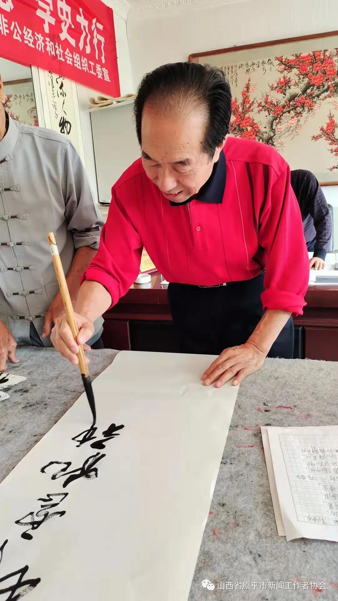 活动现场,大家畅所欲言,纷纷联系思想实际,交流了学习党史、明理知进的心得体会,围绕学史长知、学史明理、学史增信、学史兴业进行了热烈讨论。接着,书画艺术组的书法家亢银中、赵存仁、王玉伍、张正山、王福岁、王弘新,及学会顾问书画名家温树森老师、以及特邀书画名家李晋复先生,纷纷挥毫泼墨,书写出学习党史的感悟与名言。大笔挥洒中,一幅幅写有“赓续精神血脉、传承红色基因”“明理增信.崇德力行”“不忘初心、牢记使命”和“江山就是人民、人民就是江山”等字样的真、草、隶、篆、行书艺作品,从笔下飘然而出。墨香中呈现出各有千秋、韵味感人的风格,博得观赏者们的点赞称道,并争相拿到一幅赠品。书法家们顾不上喝水,整整忙了一个上午。特别是书画艺术组组长李文光,由于平时在广州忙于接送孩子上学,放暑假回原平后特地赶来,高兴地跟大家一起切磋书艺、展示才艺。书法家们还探讨了书法艺术融入社会、融入党性、服务大众、服务中心的蹊径、举措与打算。(贾宣生 王福岁)