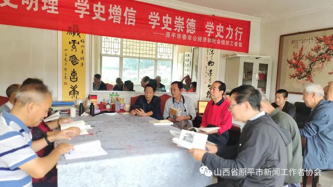 近日,原平市老年新闻文化学会组织开展了一次以学党史悟思想为主旨的专题笔会活动。学会会长杨爱英、学会党支部书记刘兴良跟学会书画艺术组成员一起,在这秋高气爽、阳光灿烂的日子里,以满腔热情来到学会办公中心柳巷牡丹园,参加了这一集研讨和书法于一体的别开生面的活动。学会文化合作单位增寿口腔、金色童年、万源石雕与奶爸奶妈等单位人员,以及部分书画爱好者共近50人,共同分享了书艺交流的喜悦。