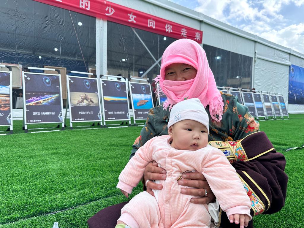 6月28日,青海省海北藏族自治州刚察县伊克乌兰乡刚察贡麻村村民德格措和孙女在诗歌节现场。新华社记者 白玛央措 摄