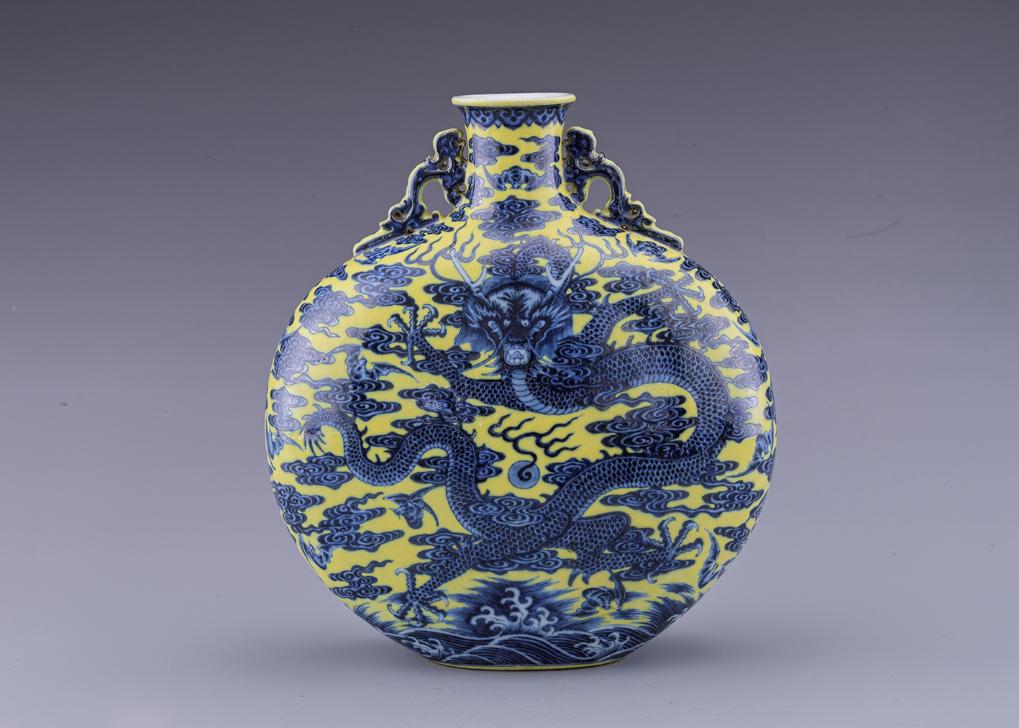 展出的清乾隆黄地青花云龙纹宝月瓶。