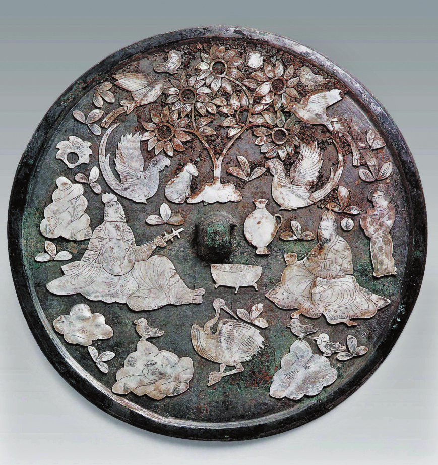 此外,漆画出现在大型器物之上,表现题材丰富,有以狩猎、出行、歌舞等日常生活为主题的现实内容,也有关于当时人们对长生道学观念的符号化纹样。南北朝时期,甚至出现了具有独特欣赏价值的木板漆画。唐、宋、元、明、清陆续出现了螺钿镶嵌、金漆、刻漆等技法的漆画。河南洛阳出土的唐代“人物花鸟纹嵌螺钿漆背铜镜”,能工巧匠以螺钿刻画出一幅人物花鸟图,画中人物头冠衣纹细腻飘逸,面容安逸,一人执阮咸,一人饮酒赏月,花鸟围绕其中,体现了当时文人高士的闲情逸致。基于历代螺钿工艺的发展沉淀,清代螺钿工艺达到新的高度,不同以往的厚螺钿片,清代匠人制作出薄如蝉翼的螺钿,富有韧性的钿片可镶嵌在不同造型的家具上,还可打磨出多样化的形态,利用刀划针刻,塑造生动形象。