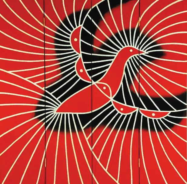 艺术家潘草原的《上升势态》系列在制作方法上延续传统工艺,使用不同质地的瓦灰调入大漆制作背景,在表现形式上彻底颠覆固有的画面结构,由符号化的装饰元素组成。部落文化图腾的抽象纹样代表某种精神象征,将肉眼不可见的精神现象物质化。有别于传统“平光亮”的打磨工艺,艺术家利用瓦灰打磨后的不同灰度层次,在画面中形成似雾朦胧的氤氲氛围。镶嵌的宝石、金属和螺钿,不同材质折射的光泽质感与大漆的黑、瓦灰形成鲜明对比,符号图腾在二维平面中显示一种“上升势态”。如今,在世界文明交流互鉴的新时代,深得中华传统文化神韵的大漆艺术应该秉持兼收并蓄的原则,焕发出新的时代光彩。(黄雨田)
